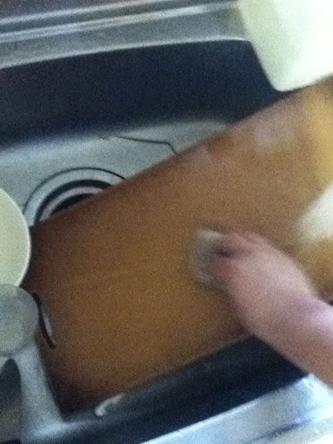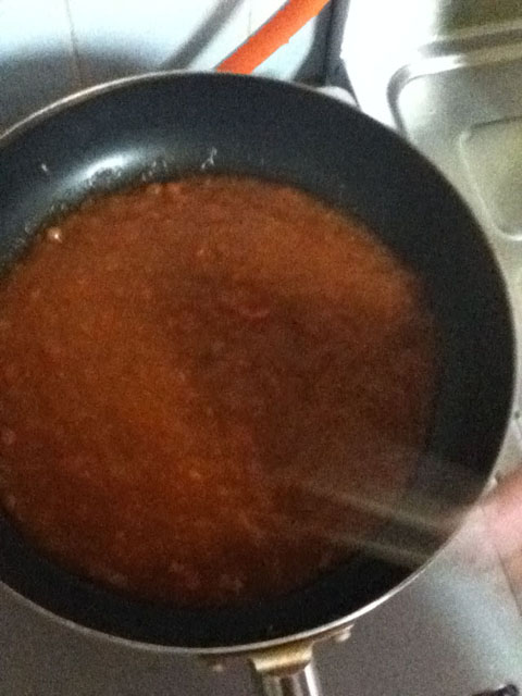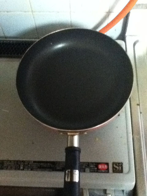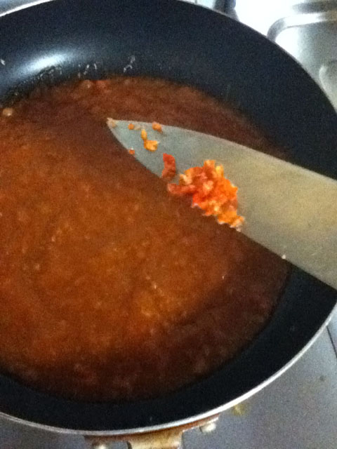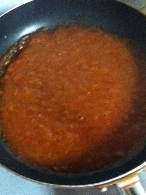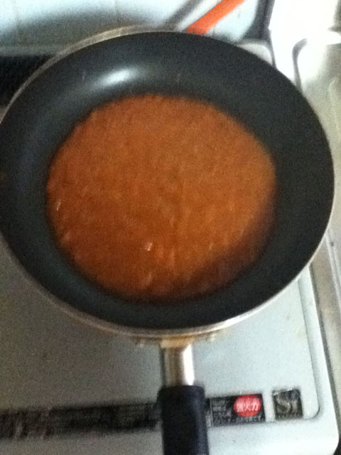そしてみじん切りができたら、フライパンにミートソースを入れて温めます