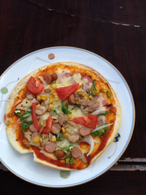 ピザ生地は、スーパーで売っている物を使用したのでちょっと薄いかなー?という感じでした